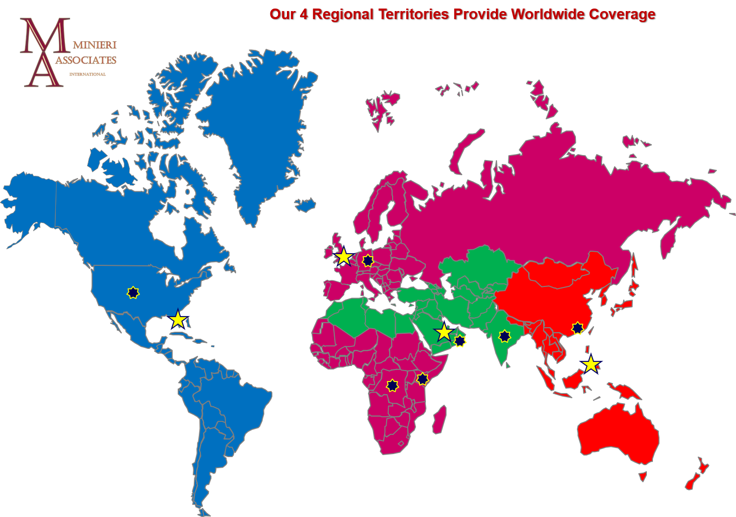 | All of our staff members have career experience working inside Systems Integrators and Guard Services. We know "their" business as well as they do! Minieri Associates International Security Consultants does not sell any equipment or provide guards. Our interests are YOUR interests. Put world-class expertise with ZERO conflicts of interest on your side of the table! See the Minieri Associates CODE OF PROFESSIONAL ETHICS. | SDM - a leading professional trade magazine - called Michael Minieri "...one of the most prominent people in the industry" in a cover story and exclusive interview. See his complete C/V online at Michael Minieri Info If he is online right NOW, any client, prospective client or previous client may reach him directly using the LIVE CHAT button above. More Contact Methods | Started in the U.S.A. we have served 37 countries so far and still counting! MA will take on projects most anywhere on earth from our 4 Regional Territories! We assign the MOST QUALIFIED consultants & engineers for the scope and nature of your project, no matter where he or she is based. We work WITH YOU to define your specific needs and our required tasks then provide a NO COST, NO OBLIGATION written proposal and quotation for your consideration. (mouse-over map to enlarge) |